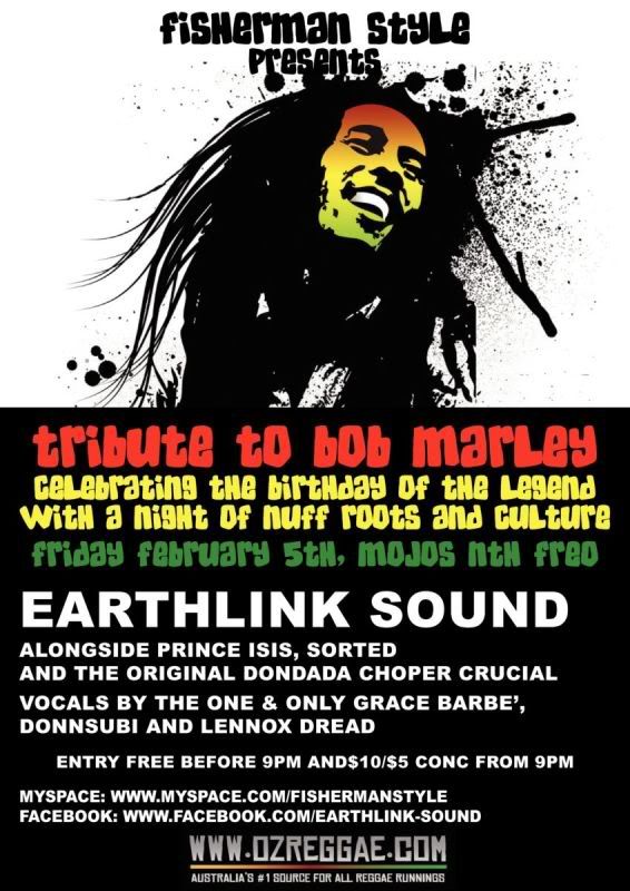 It's that time of year again. EARTHLINK SOUND present a celebration of a Legend, and one of Jamaica’s true national icons, with a Tribute to BOB MARLEY at FISHERMANS STYLE, Mojos Bar, North Fremantle, on what would have been the Tuff Gong’s 65th Birthday, Friday the 5th of February.